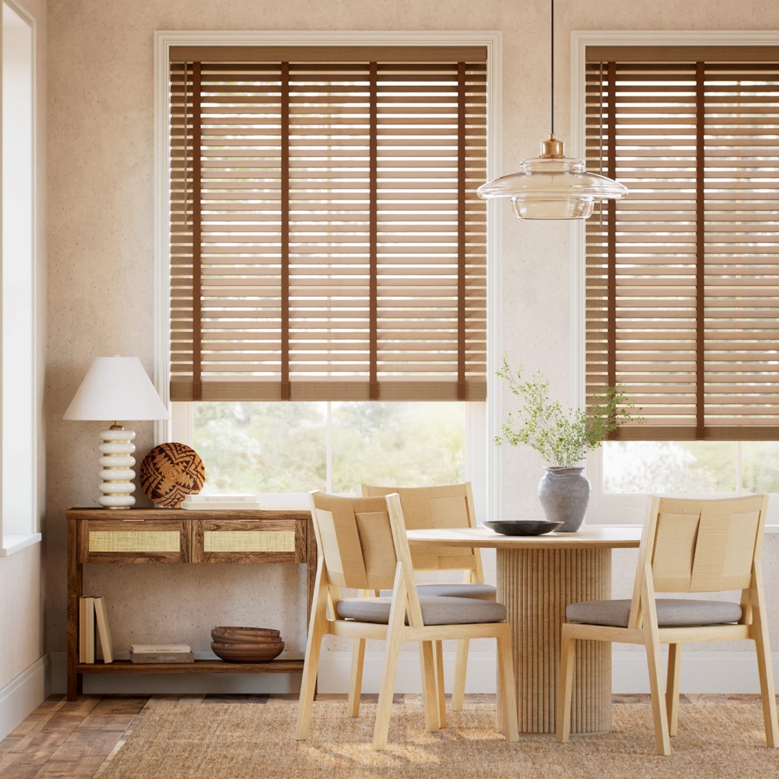 優しいチョコレートブラウンの天然木スラットは、ダークブラウンのラダーテープが上品でナチュラルな雰囲気。 耐久性、実用性を兼ね備え、どんなお部屋にもスマートにマッチするでしょう。