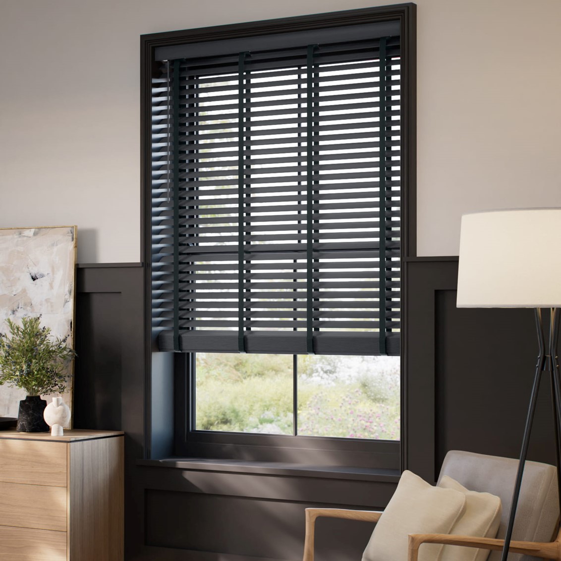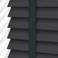メトロポリタン スレートと&ジェット ウッドブラインドは、ダークグレーのスラットにダークグレーのラダーテープがシャープでモダンな印象を与えます。
