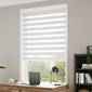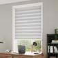 調光ロールスクリーンは厚手生地と薄地ボイルがゼブラの横縞に織り込まれた生地を、前後で上下にスライドさせることでアルミブラインドのように光を調節できます。