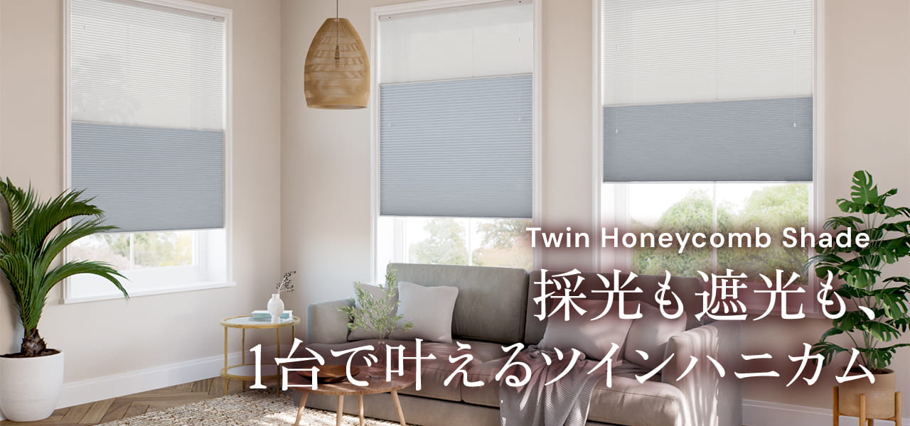 ツインハニカムシェードは、1台で採光と遮光の2枚の生地を切り替えて使える機能的なブラインドです。 日中はやわらかく光を取り入れ、夜はしっかりとプライバシーを守ります。 断熱性にも優れており、季節を問わず快適な空間づくりにおすすめです。 カラーや色の組み合わせも豊富に揃え、お部屋に合わせたスタイルをお選びいただけます。