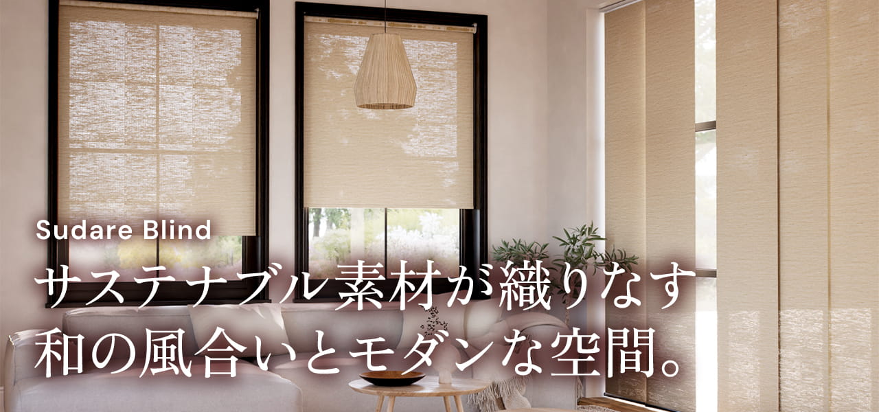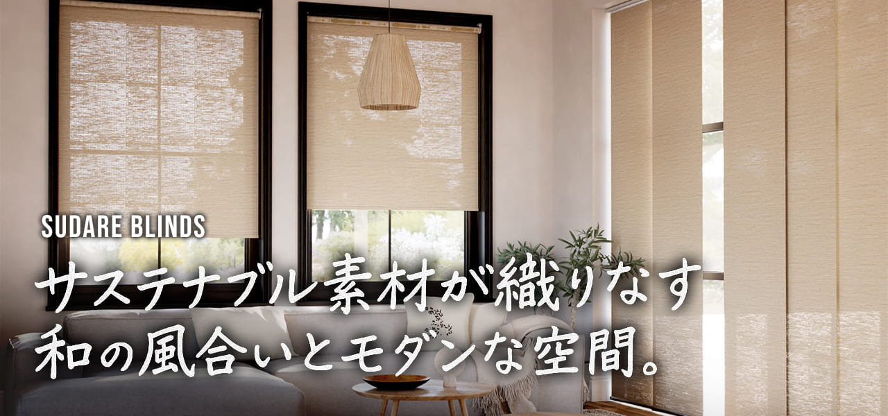自然素材や再生紙を使ったサステナブルな「すだれシリーズ」。伝統的な風合いを残しながらも、多彩なスタイルで現代の住まいになじむデザインが魅力です。ナチュラルな質感は、和室にも洋室にも溶け込み、季節を問わず心地よい空間を演出します。